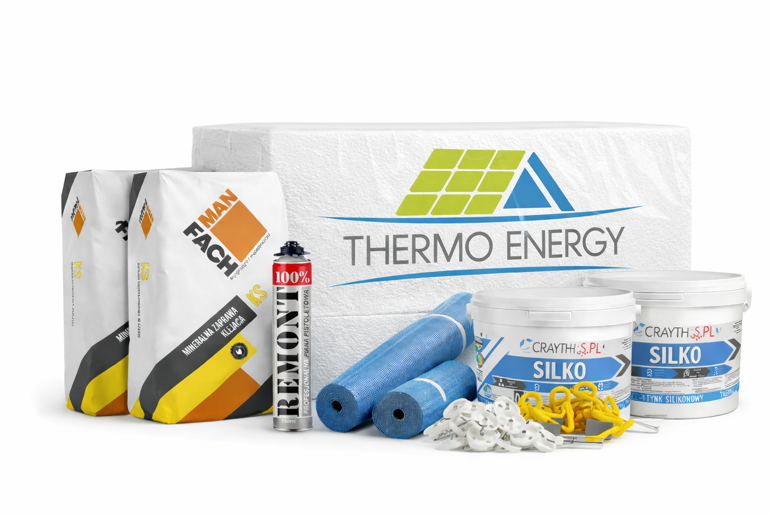 Zestaw zawiera wszystkie podstawowe elementy potrzebne do ocieplenia elewacji, w tym: